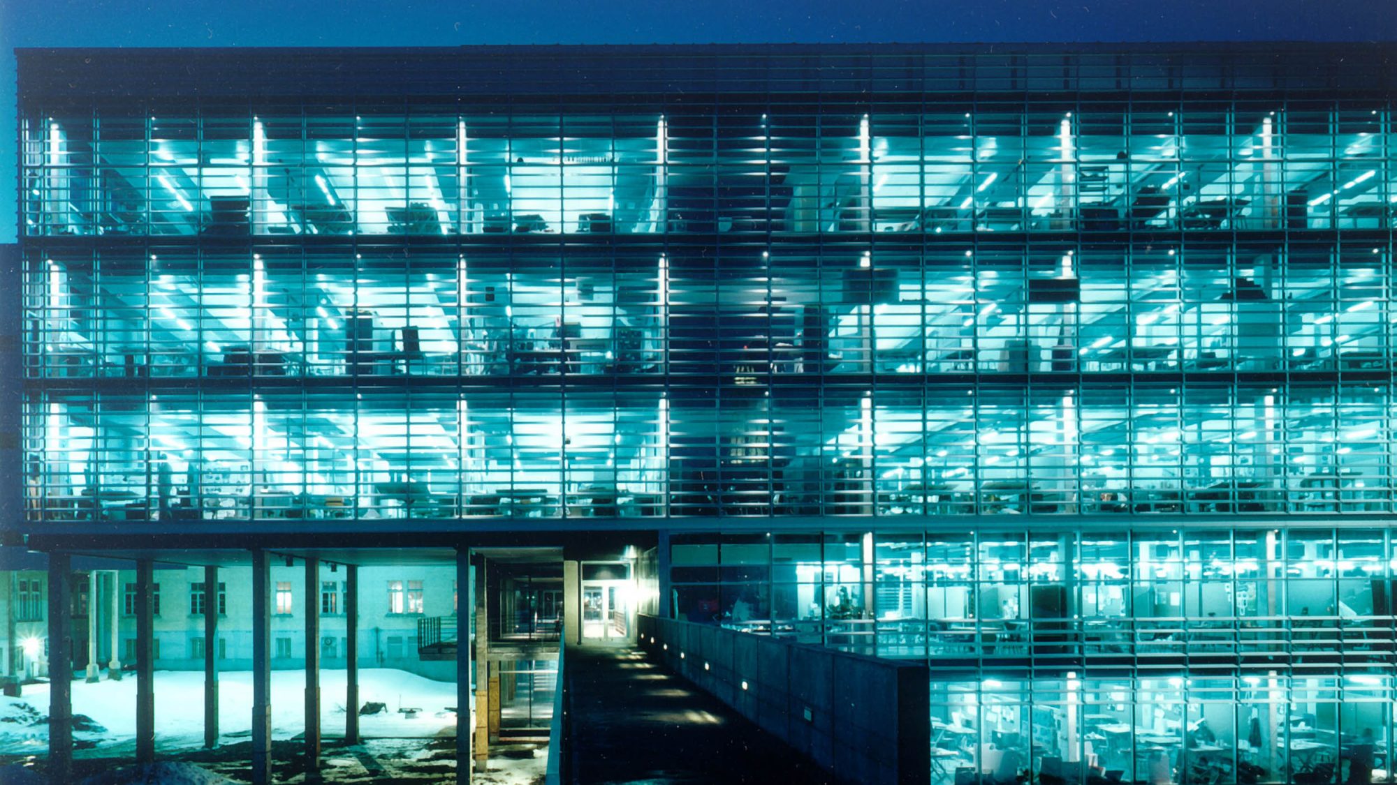 Le nouveau bâtiment est relié à l’aile existante nord par un passage à plusieurs niveaux donnant sur un atrium de 15 mètres de haut abrité par une verrière inclinée s’ouvrant sur la cour intérieure. Un pont/passerelle relie le bâtiment sud à celui du côté ouest et porte la façade nord (en verre) en porte-à-faux.